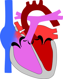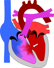 Der VSD ist der häufigste angeborene Herzfehler. Es besteht ein angeborenes Loch in der Scheidewand (Septum) zwischen den Herzkammern. Da in der linken Kammer der Druck höher ist als in der rechten Kammer, fließt bei jedem Herzschlag Blut von der linken in die rechte Herzkammer (Links – Rechts – Shunt) und von dort in die Lunge. Es kommt zu einer Lungenüberflutung. Je größer der Defekt ist, umso mehr Blut fließt durch und umso gravierender sind die Auswirkungen. Es muss individuell entschieden werden, ob und wann ein operativer Verschluss des Defektes vorgenommen wird. Bei der schwersten Form mit Lungenhochdruck sollte die Operation im 3.-5. Lebensmonat erfolgen, um eine bleibende Schädigung der Lunge zu vermeiden.